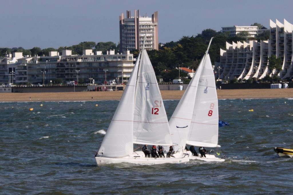 De mémoire de suiveurs on avait rarement vu des duels aussi explosifs sur un Championnat de France Espoirs de Match-Racing. Après un Round Robin et des quarts de finale déjà bien accrochés le niveau est encore monté d’un cran ce dimanche pour la dernière journée, disputée dans des conditions typiques de la Baie de la Baule en cette fin d’automne, avec du vent de Nord-Est qui a bien rafraichi l’atmosphère mais offert un terrain de jeu parfait pour les équipages en lice sur les demi-finales. Hier, Victorien Eon et Ian Garreta (SR Antibes) avaient décroché un premier point avant la fin de journée. Un avantage qu’ils ont perdu dès leurs premiers matchs ce matin… 1 partout, balle au centre et place au show. Dans son duel face à son partenaire d’entrainement Tom Foucher (APCC Nantes), Victorien Eon s’en est finalement sorti, en s’imposant 3 à 1 au bout de matchs très accrochés. De l’autre côté du tableau, dans l’autre duel fratricide entre les équipages de la SR Antibes de Ian Garreta et Ange Delerce, on a assisté à du grand spectacle, les deux duos poussant les limites du plan d’eau et s’offrant mutuellement une visite complète de la Baie de la Baule à force de se chamailler à chaque bouée.